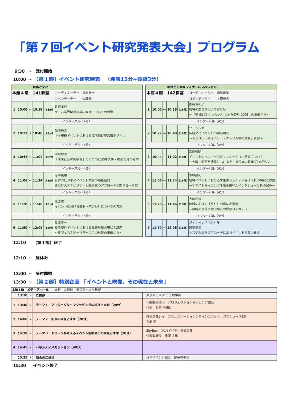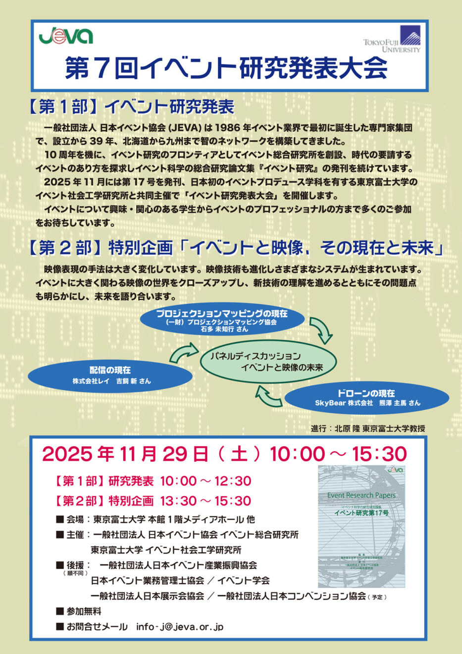 2025年11月07日 ご案内 第7回イベント研究発表大会 開催のご案内(一社)日本イベント協会様より、 第7回イベント研究発表大会開催のご案内です。日時2025年11月29日(土) 10:00〜15:30場所東京富士大学(東京都新宿区高田馬場)当団体も後援をしています。 参加費無料ですので、是非ご参加ください。表面裏面 前の記事 一覧 次の記事